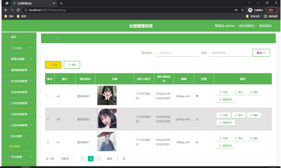 如图5.3显示的就是团长信息管理页面,此页面提供给管理员的功能有:根据团长信息进行条件查询,还可以对团长信息进行新增、修改、查询操作等等。