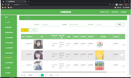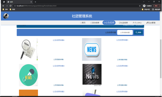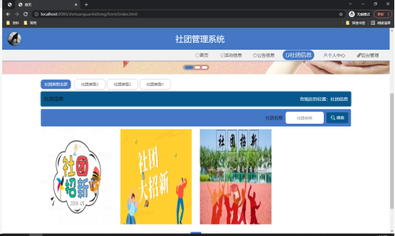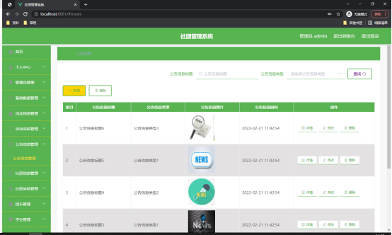 如图5.2显示的就是社团信息管理页面,此页面提供给管理员的功能有:查看已发布的社团信息数据,修改社团信息,社团信息作废,即可删除,还进行了对社团信息名称的模糊查询 社团信息信息的类型查询等等一些条件。