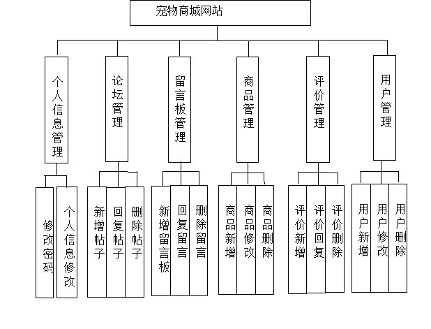 宠物商城网站系统在进行系统中功能模块的划分时,采用层次图来进行表示。层次图具有树形结构,它能使用矩形框来描绘数据信息。顶层代表的数据结构很完整,顶层下面的矩形框表示的数据就是子集数据,当然处于最下面的矩形框就是不能再进行细分的数据元素了,使用层次方框图描述系统功能能让用户一目了然,能够明白系统的功能,以及对应功能板块下面的子功能都可以清楚领会。宠物商城网站分为管理员和用户两部分操作角色,下面将对他们的功能进行阐述。