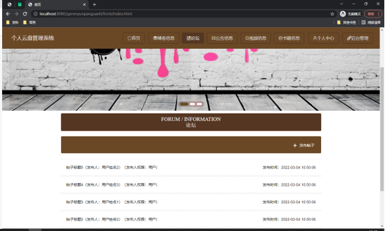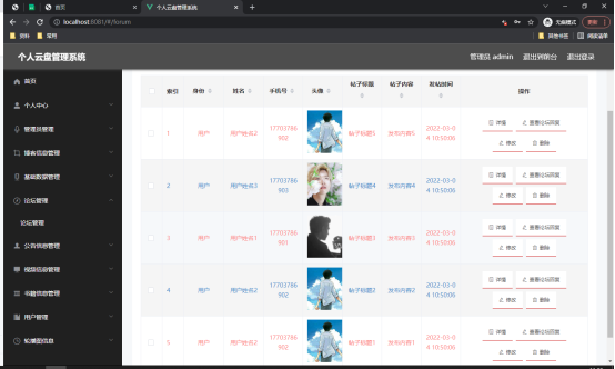 如图5.4显示的就是论坛信息管理页面,此页面提供给管理员的功能有:根据论坛信息进行新增、修改、查询操作等等。