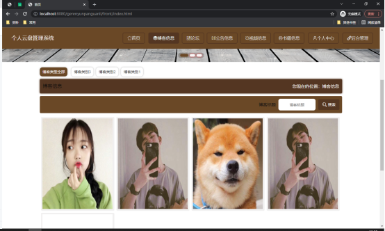 如图5.2显示的就是博客信息管理页面,此页面提供给管理员的功能有:查看已发布的博客信息数据,修改博客信息,博客信息作废,即可删除,还进行了对博客信息名称的模糊查询 博客信息信息的类型查询等等一些条件。