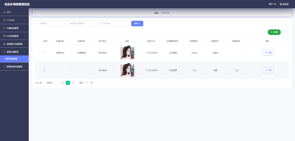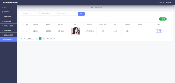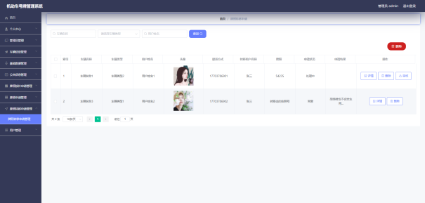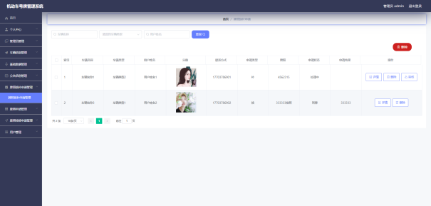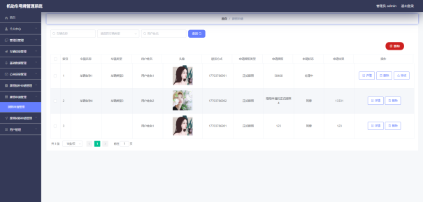 管理员进入如图5-2所示的牌照换补申请管理界面之后,管理员点击信息显示栏中最右侧的详情,删除按钮可依次完成牌照换补申请信息的详情查看,删除等操作,管理员在当前界面也能对未处理的牌照换补申请信息进行审核。