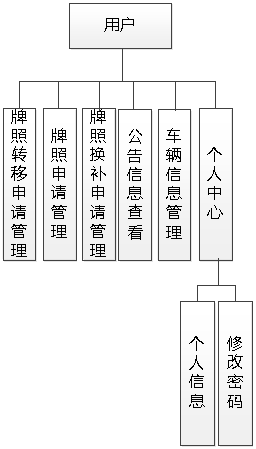 用户功能结构图的绘制结果见图4-2。用户登录进入本系统操作的功能包括申请牌照换补,申请牌照,申请牌照转移,查看公告,管理车辆信息等。