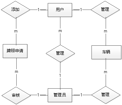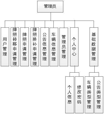 管理员功能结构图的绘制结果见图4-1。管理员登录进入本系统操作的功能包括管理车辆,管理公告,管理用户,审核牌照换补申请信息,审核牌照申请信息,审核牌照转移申请信息等。