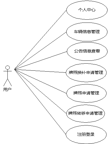 用户用例图的绘制结果见图3-6。用户登录进入本系统操作的功能包括申请牌照换补,申请牌照,申请牌照转移,查看公告,管理车辆信息等。