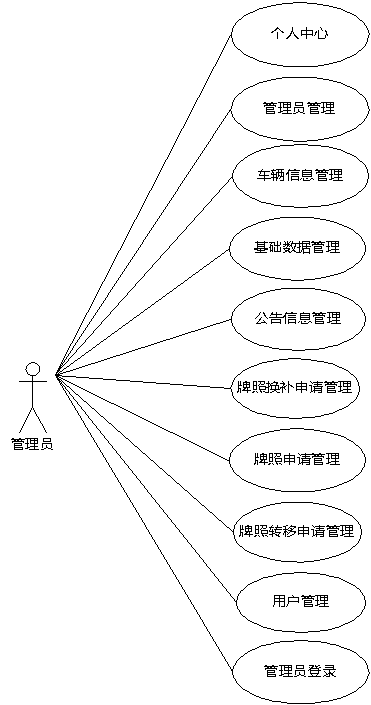 管理员用例图的绘制结果见图3-5。管理员登录进入本系统操作的功能包括管理车辆,管理公告,管理用户,审核牌照换补申请信息,审核牌照申请信息,审核牌照转移申请信息等。