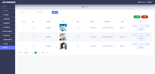 管理员进入如图5-5所示的用户管理界面之后,管理员点击信息显示栏中最右侧的修改,删除按钮可依次完成用户信息的修改,删除操作,管理员也能在本界面为用户账户重置密码。