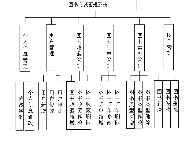 在分析并得出使用者对程序的功能要求时,就可以进行程序设计了。如图4.2展示的就是管理员功能结构图,管理员在后台主要管理收货地址管理、购物车管理、字典管理、图书管理、图书收藏管理、图书评价管理、图书订单管理、用户管理、管理员管理等。