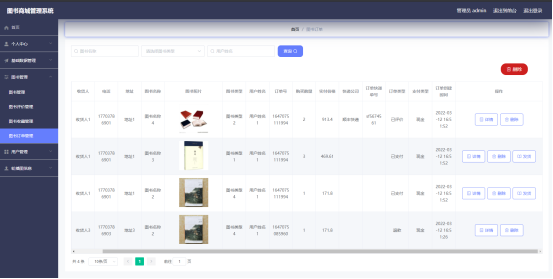 图书订单信息管理页面提供的功能操作有:发货,删除图书订单操作。下图就是图书订单信息管理页面。