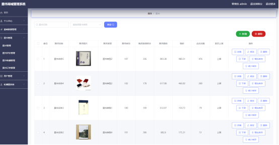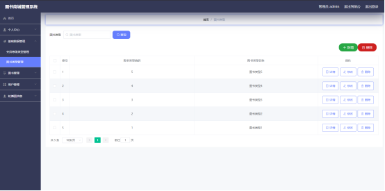 如图5.1显示的就是图书列表页面,此页面提供给管理员的功能有:查看图书、新增图书、修改图书、删除图书等。