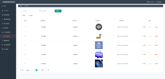 图5.3 即为编码实现的公告信息管理界面,公告的内容需要管理员添加,在公告信息管理界面,管理员也能修改公告内容。