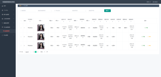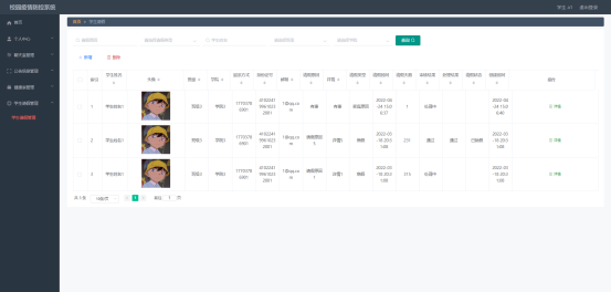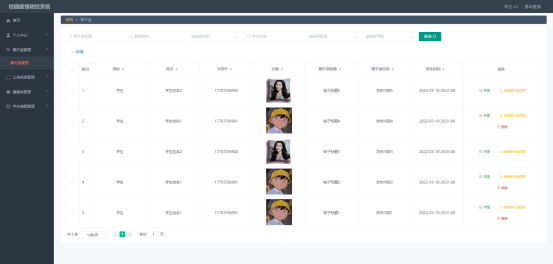 图5.5 即为编码实现的学生请假管理界面,学生申请请假,教师就需要在学生请假管理界面审核。学生请假信息有请假原因,请假时间,请假状态等信息。