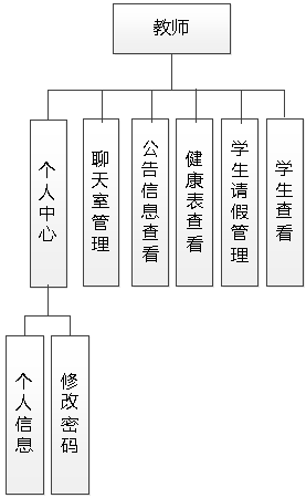 图4.2即为设计的教师功能结构,教师权限操作的功能包括发布聊天信息,回复聊天信息,查看学生健康信息,审核学生请假信息,查看学生信息等。