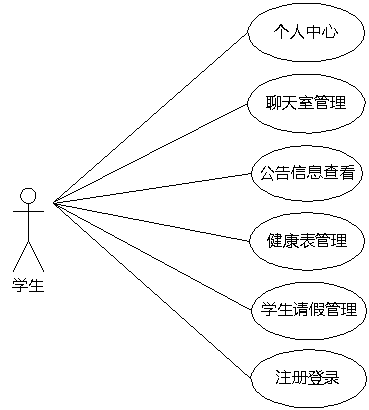 图3.7即为学生用例图,学生权限操作的功能包括管理聊天室的聊天信息,可以添加请假信息,查看教师对学生请假的处理结果信息,登记并管理学生自己的健康信息等。
