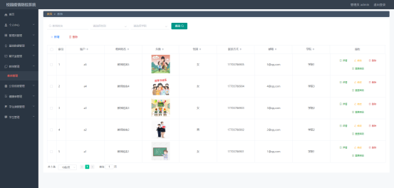 图5.1 即为编码实现的教师管理界面,教师信息包括教师姓名,学院,邮箱等信息,管理员对有错误数据的教师信息使用修改功能可以及时更正,需要删除的教师信息也能使用删除功能及时删除。