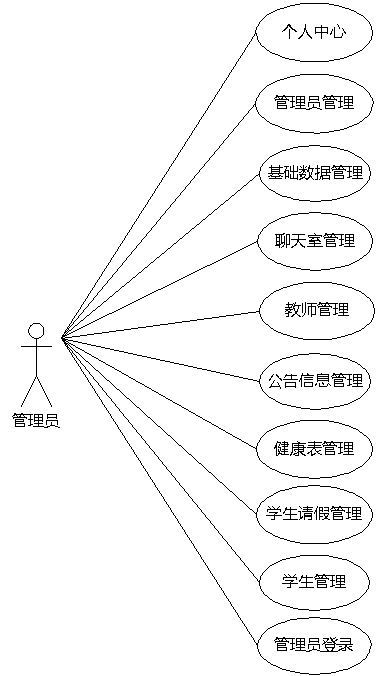 图3.5即为管理员用例图,管理员权限操作的功能包括查看学生的健康信息,管理聊天室信息,对教师,学生请假,学生,公告信息进行管理。