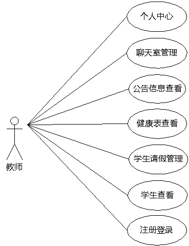 图3.6即为教师用例图,教师权限操作的功能包括发布聊天信息,回复聊天信息,查看学生健康信息,审核学生请假信息,查看学生信息等。