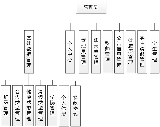 图4.1即为设计的管理员功能结构,管理员权限操作的功能包括查看学生的健康信息,管理聊天室信息,对教师,学生请假,学生,公告信息进行管理。