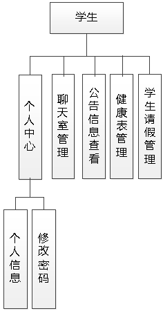 图4.3即为设计的学生功能结构,学生权限操作的功能包括管理聊天室的聊天信息,可以添加请假信息,查看教师对学生请假的处理结果信息,登记并管理学生自己的健康信息等。