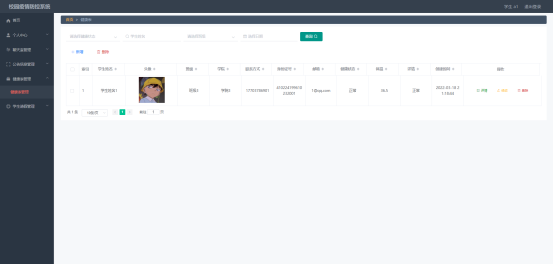 图5.7 即为编码实现的健康表管理界面,学生自己在健康表管理界面登记健康信息,包括学生的体温,详情等信息都需要登记,已经登记的有错误数据的健康信息可以进行修改。