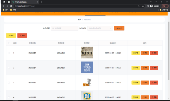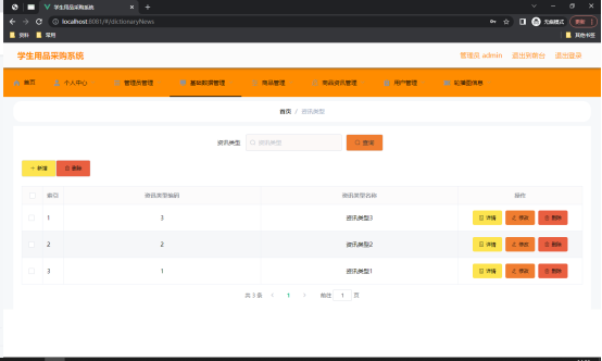 如图5.3显示的就是资讯类型管理页面,此页面提供给管理员的功能有:根据资讯类型进行条件查询,还可以对资讯类型行新增、修改、查询操作等等。