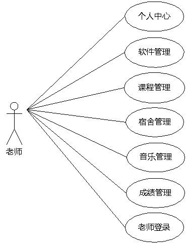 图3.6即为老师用例图,老师权限操作的功能包括管理成绩,管理宿舍,管理宿舍归寝,管理宿舍报修,管理音乐,管理软件等。