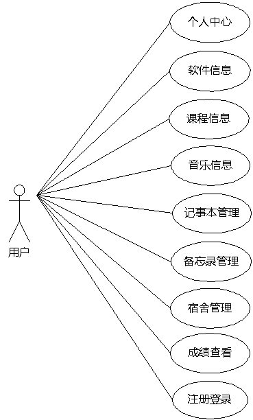 图3.7即为用户用例图,用户权限操作的功能包括下载软件安装包,观看课程视频以及软件安装视频,播放音乐,查看成绩,管理备忘录以及记事本信息,提交宿舍报修信息,查看宿舍人员信息等。