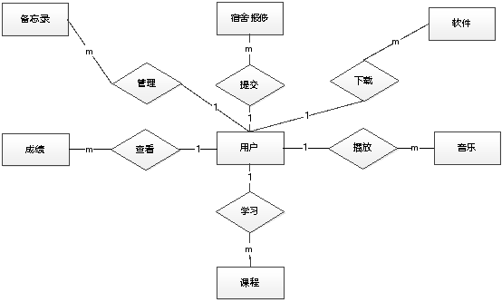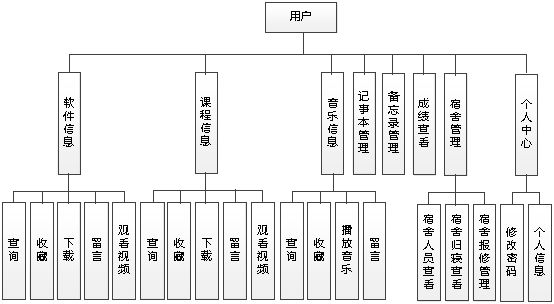 图4.3即为设计的用户功能结构,用户权限操作的功能包括下载软件安装包,观看课程视频以及软件安装视频,播放音乐,查看成绩,管理备忘录以及记事本信息,提交宿舍报修信息,查看宿舍人员信息等。