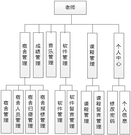 图4.2即为设计的老师功能结构,老师权限操作的功能包括管理成绩,管理宿舍,管理宿舍归寝,管理宿舍报修,管理音乐,管理软件等。