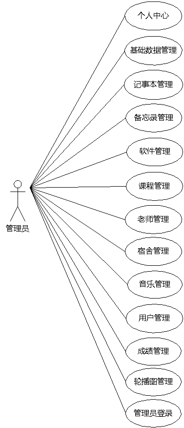 图3.5即为管理员用例图,管理员权限操作的功能包括管理记事本,管理备忘录,管理软件,管理课程,管理音乐,管理宿舍,管理成绩,管理老师等。
