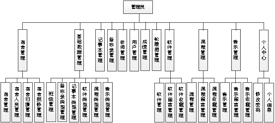 图4.1即为设计的管理员功能结构,管理员权限操作的功能包括管理记事本,管理备忘录,管理软件,管理课程,管理音乐,管理宿舍,管理成绩,管理老师等。