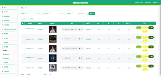 图5.1 即为编码实现的音乐管理界面,管理员下架音乐,上架音乐,修改音乐信息,包括修改音乐热度,音乐名称,音乐类型等信息,删除音乐,查询音乐等。