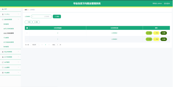 企业公告类型管理页面显示所有企业公告类型,在此页面既可以让管理员添加新的企业公告信息类型,也能对已有的企业公告类型信息执行编辑更新,失效的企业公告类型信息也能让管理员快速删除。下图就是企业公告类型管理页面。