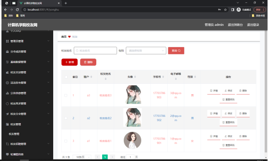 如图5.1显示的就是校友信息管理页面,此页面提供给管理员的功能有:校友信息的查询管理,可以删除校友信息、修改校友信息、新增校友信息,
