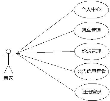 图3.6即为商家用例图,商家权限操作的功能包括新增汽车,上架汽车,下架汽车,回复汽车留言,管理汽车收藏,管理论坛信息。