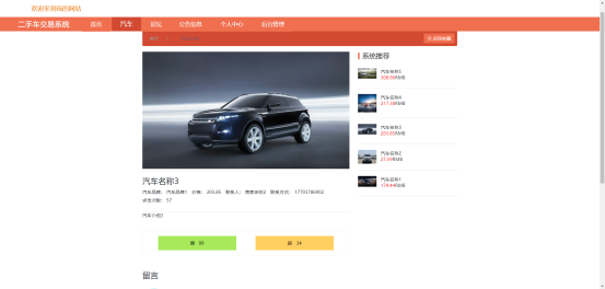 图5.7 即为编码实现的汽车信息界面,用户查看汽车信息界面右侧区域展示的系统推荐的汽车信息,用户可以通过汽车介绍的查看来了解汽车,用户可以对汽车点赞或踩,也能在汽车信息界面下方的留言区域发布汽车的留言。