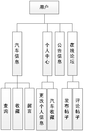 图4.3即为设计的用户功能结构,用户权限操作的功能包括收藏汽车,发布关于汽车的留言,查看汽车的介绍信息,通过论坛进行信息讨论与交流,查看公告等。
