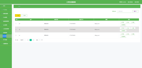 图5.1 即为编码实现的商家管理界面,商家信息包括联系方式,邮箱,商家名称等信息。管理可以使用修改功能对登记有误的商家信息进行修改,可以删除需要删除的商家信息等。