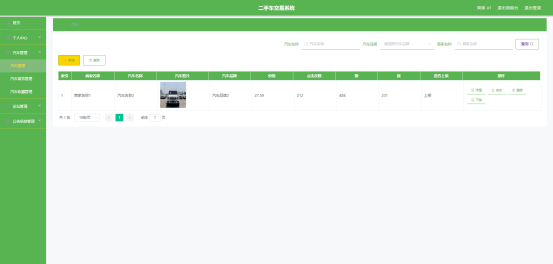 图5.4 即为编码实现的汽车管理界面,汽车信息包括价格,汽车照片等信息,商家可以新增汽车信息,可以下架汽车,上架汽车以及删除需要删除的汽车信息等。