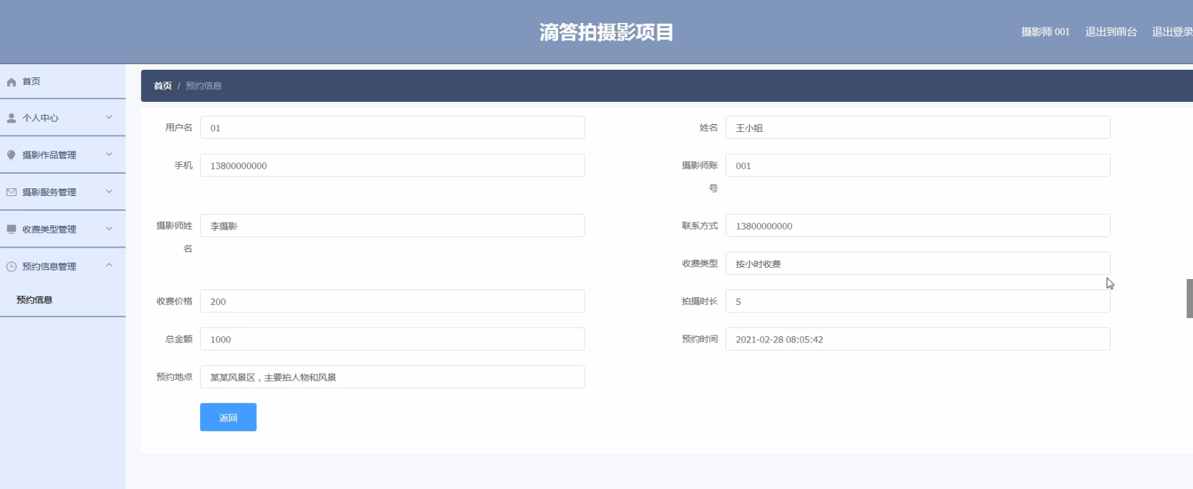 预约信息管理,用户可以查看预约进行对摄影师进行预约、支付查看审核等操作。效果如下图所示5-14所示