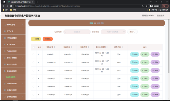 如图5.3显示的就是设备信息管理页面,此页面提供给管理员的功能有:根据设备信息进行条件查询,还可以对设备信息进行新增、修改、查询操作等等。