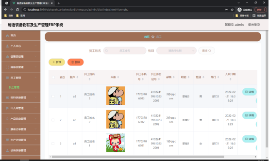 如图5.1显示的就是员工信息管理页面,此页面提供给管理员的功能有:员工信息的查询管理,可以删除员工信息、修改员工信息、新增员工信息,