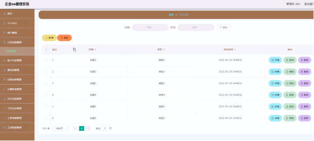 系统管理员可以查看对公告信息进行添加,修改,删除以及查询操作。具体界面如图5.2所示。