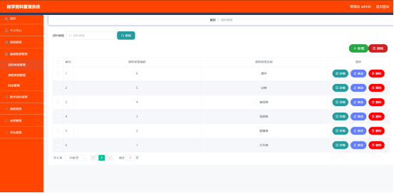 教学资料类型管理页面显示所有教学资料类型,在此页面既可以让管理员添加新的教学资料信息类型,也能对已有的教学资料类型信息执行编辑更新,失效的教学资料类型信息也能让管理员快速删除。下图就是教学资料类型管理页面。