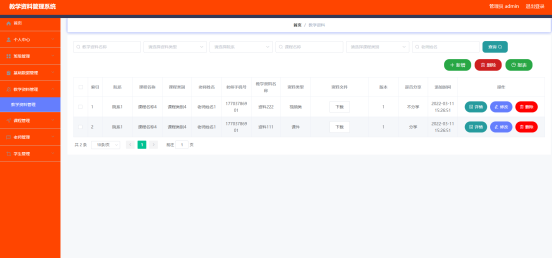 教学资料信息管理页面提供的功能操作有:新增教学资料,修改教学资料,删除教学资料操作。下图就是教学资料信息管理页面。