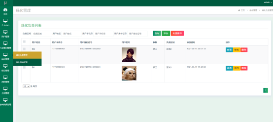 如图5.3显示的就是绿化负责管理页面,此页面提供给管理员的功能有:新增绿化负责,修改绿化负责,删除绿化负责。