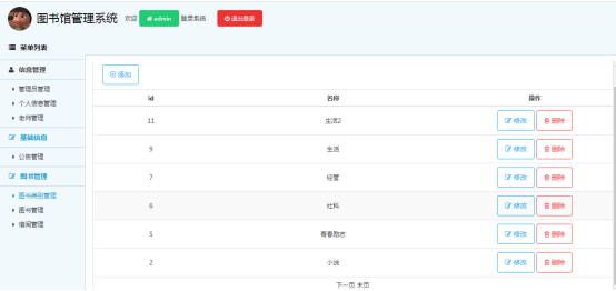 如图5.4显示的就是公告类型管理页面,此页面提供给管理员的功能有:新增公告类型,删除公告类型,修改公告类型。