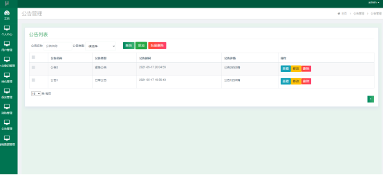 如图5.2显示的就是公告管理页面,此页面提供给管理员的功能有:新增公告,修改公告,删除公告。