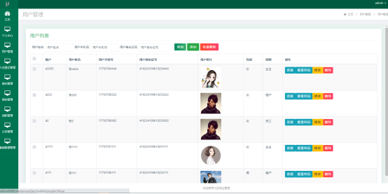 如图5.1显示的就是用户管理页面,此页面提供给管理员的功能有:新增用户,修改用户,删除用户。