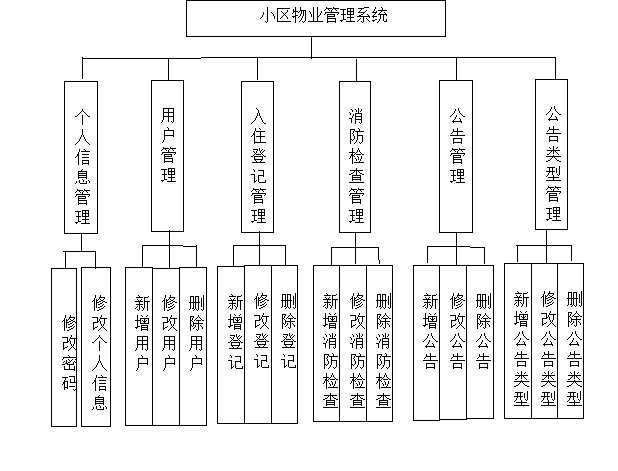 在分析并得出使用者对程序的功能要求时,就可以进行程序设计了。如图4.2展示的就是管理员功能结构图,管理员主要负责填充绿化和其类别信息,并对已填充的数据进行维护,包括修改与删除,管理员也需要对公告,对绿化,对保安,对消防等进行管理。